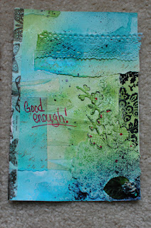 For our last challenge we had to combine 3 of the 5 challenges that we were posed with over the last month and a half. We HAD to use week 3...the layered background and week 2, paper layering, plus one of our choice. I chose the foil tape. I did use a 12 x 12 canvas because I have been dying to try a crayon melting technique. Aubrey Sue was so sweet to help me pick through her broken crayon bits and peel them one by one. Then we arranged them on the canvas and hot glued them down. Next came the fun part....melting. It was so freeing and just a hoot to do. I LOVE how the wax got so thin at the top that you could actually see some of the patterned paper through the wax.
